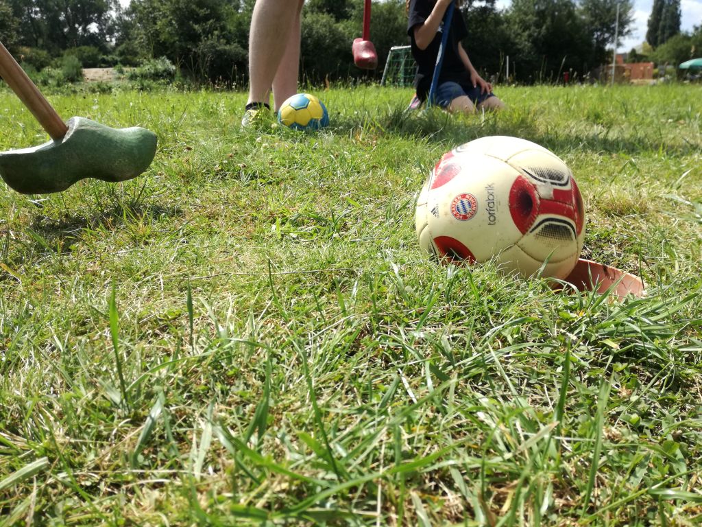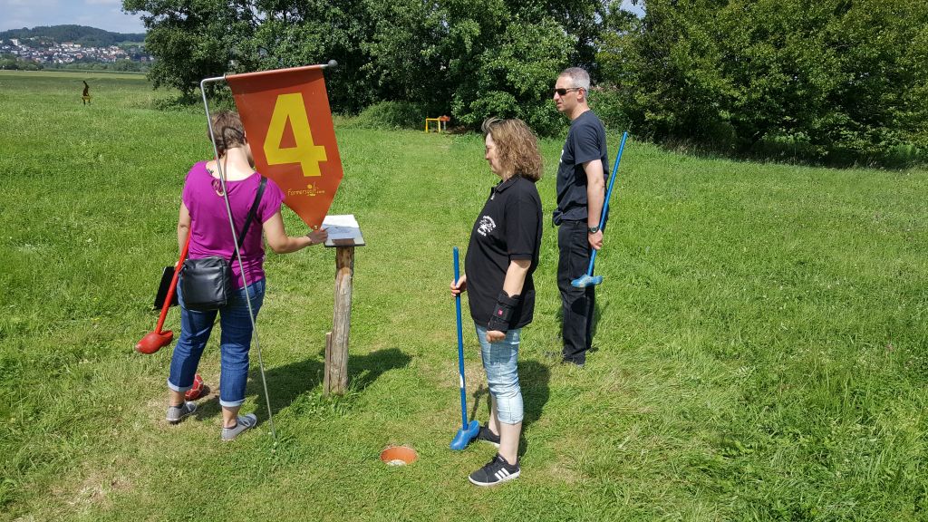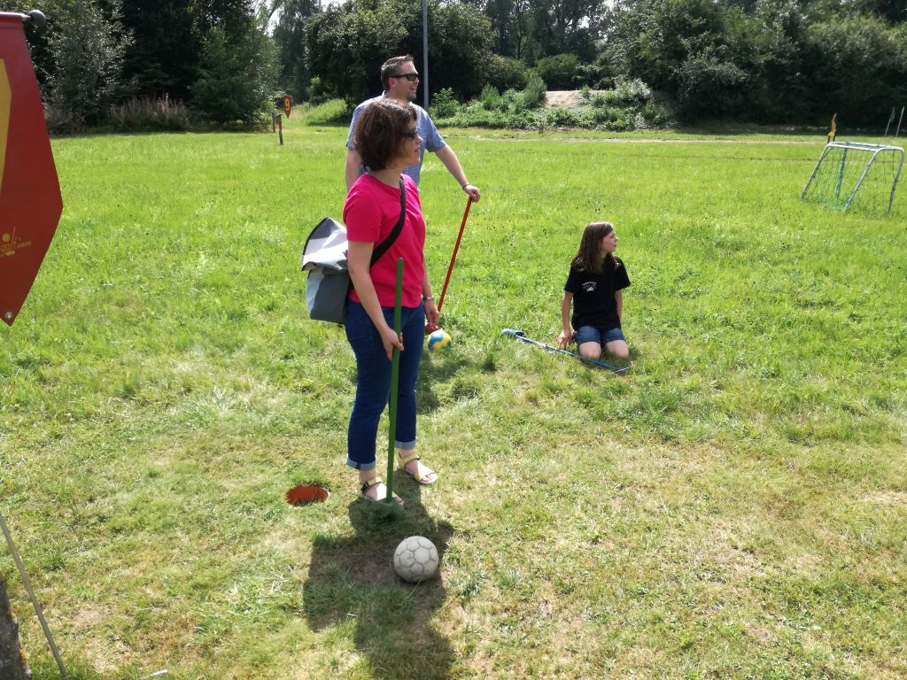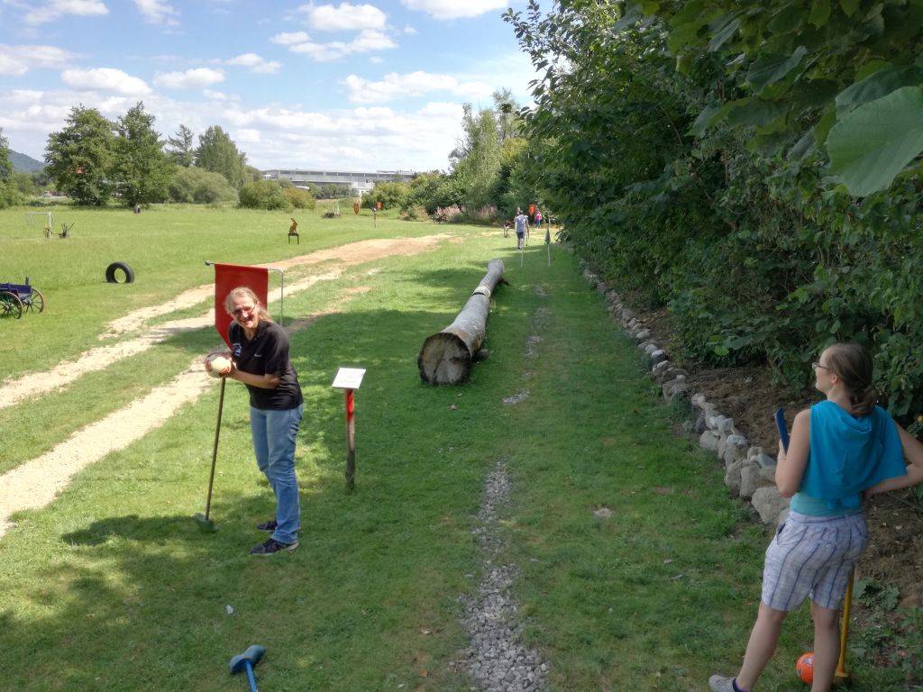 In Waldmünchen wurden die Musikanten dann von unserer „Verbindungsperson“ Elke Tweedale begrüßt. Nach dem Ausladen der Instrumente und Koffer und dem anschließenden Mittagessen in der „Wasserwirtschaft“ in Cham ging es dann weiter zum „Bauerngolf“. Bei dieser an Minigolf erinnernden Sportart wird ein kleiner Fußball mit einem an einem Stock befestigten Holzschuh über einen Geländeparcours geschlagen. Wie sich bald herausstellte hatte der Betreiber des Parcours nicht zuviel versprochen, als er den Musikanten eine „Mordsgaudi“ angekündigt hatte.