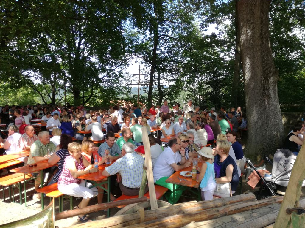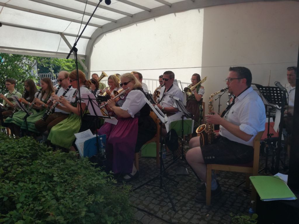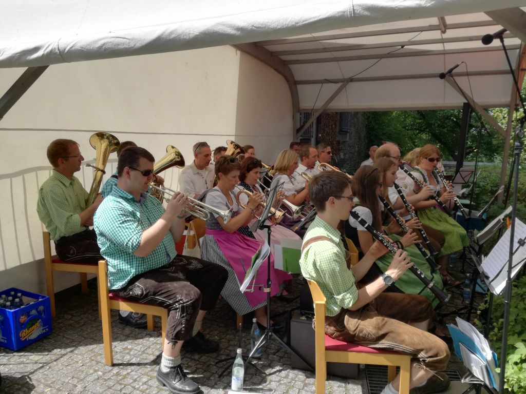 strahlendem Sonnenschein stattfand. Verstärkt durch ein paar Waldmünchener Musikanten, spielten hier die Elzer für drei Stunden auf. Im Anschluss gaben sich dann noch die „Original Elzkrainer“ die Ehre. Diese vor zwei Jahren anlässlich des damaligen Waldmünchener Schlossfests gegründete Besetzung heizte den anwesenden Gästen denn nochmals so richtig ein. Auch wenn dies bei den vorherrschenden Temperaturen nicht unbedingt nötig gewesen wäre... Bei Kaffee und Kuchen bzw. Zwiebelkuchen und Wein/Bier klang denn dieser Sonntag gemütlich für den Musikverein aus.
